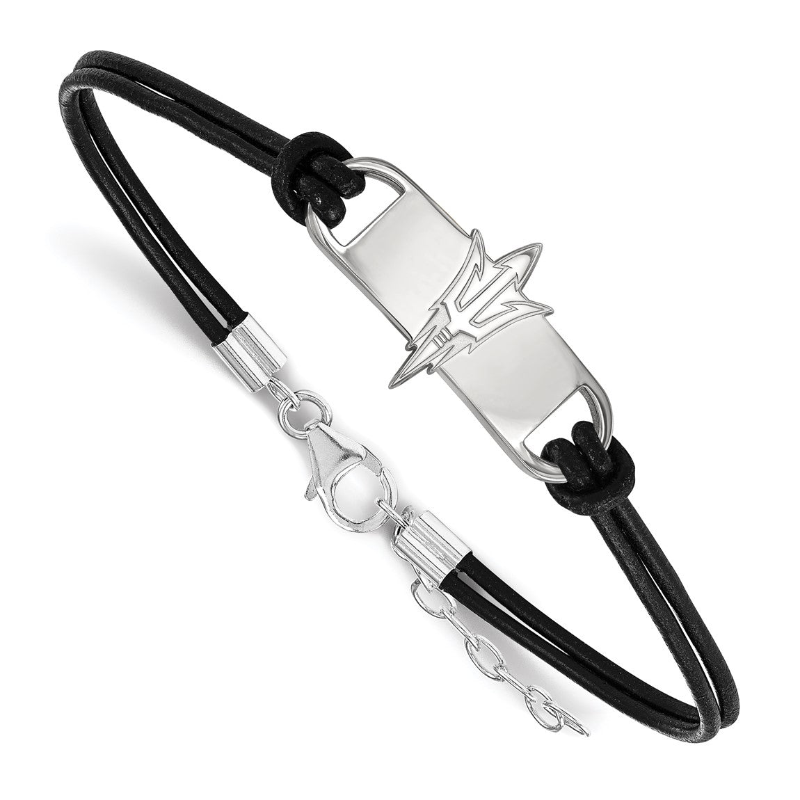 Sterling Silver Rhodium-plated LogoArt Arizona State University Pitchfork Small Center Black Leather 7 inch Bracelet with Extender