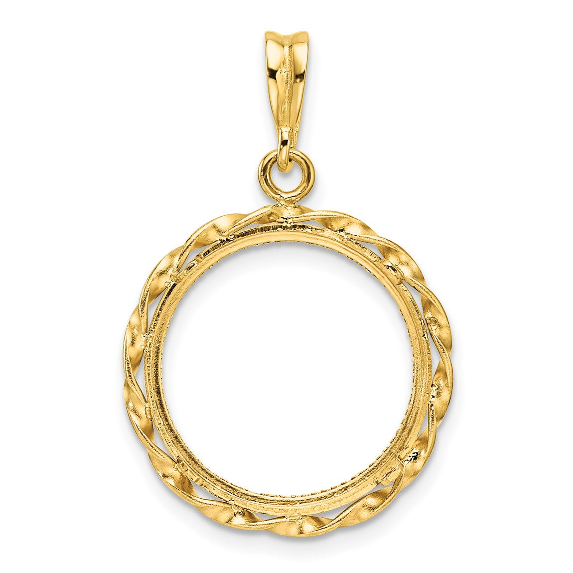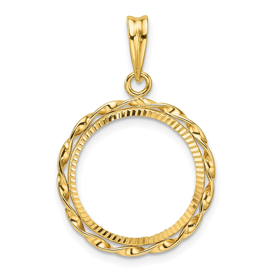 14k Polished Hand Twisted Ribbon and Diamond-cut 16.5mm Prong Coin Bezel Pendant - Fits 1/10 oz American Eagle and 1/10 oz Krugerrand