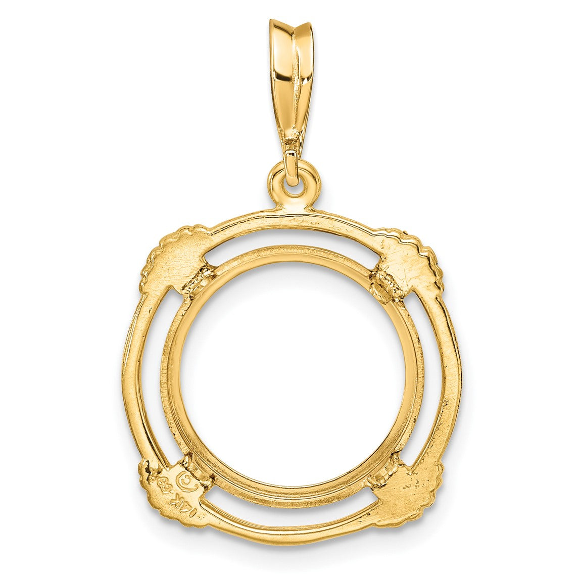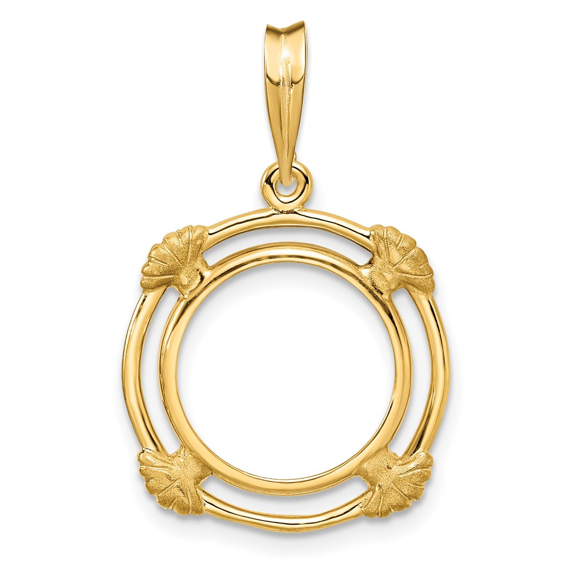 14k Yellow Gold 14mm Polished w/ Satin Shell Spokes Prong Coin Bezel Pendant - Fits 1/20 oz Maple Leaf and Other Coins