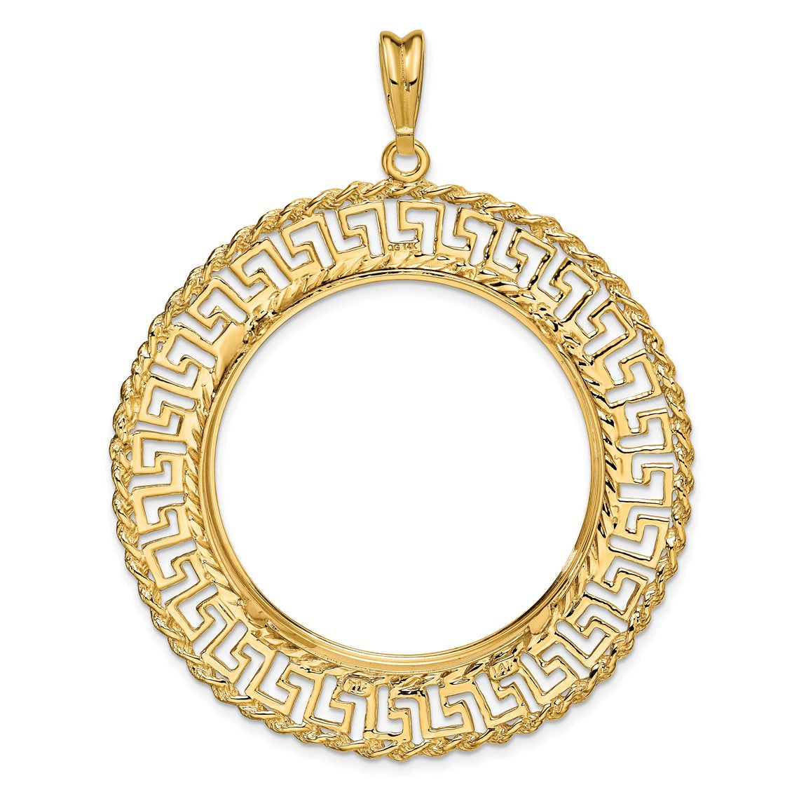 14k Yellow Gold 32.7mm Greek Key w/ Rope Border Prong Coin Bezel Pendant - Fits 1 oz American Eagle, 1 oz Cat, and 1 oz Krugerrand