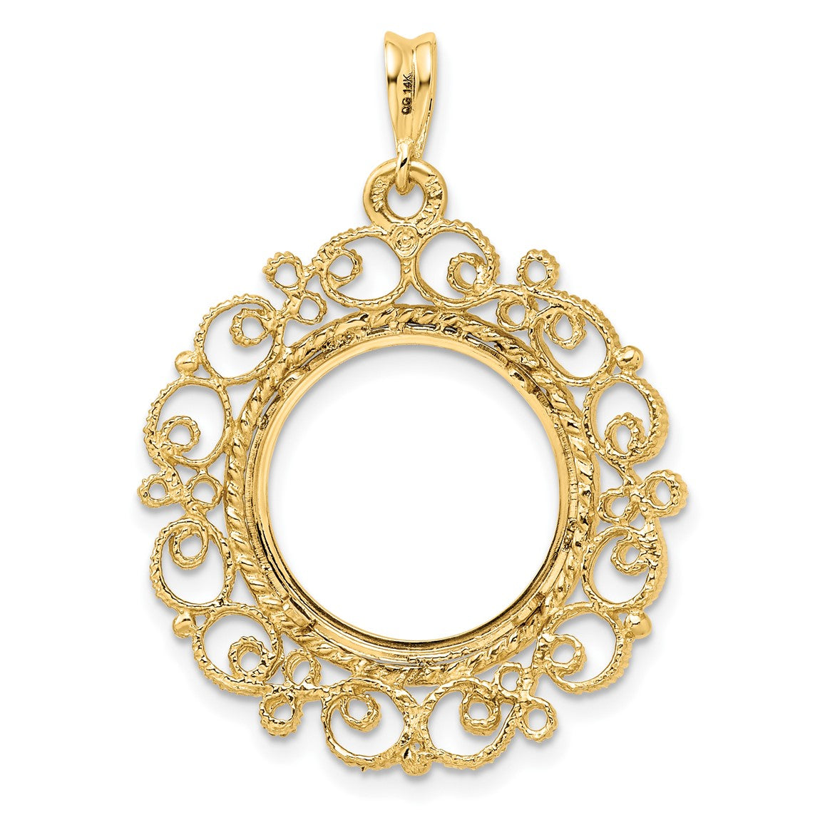 14k Yellow Gold Polished 16.5mm Victorian-style Prong Coin Bezel Pendant - Fits 1/10 oz American Eagle and 1/10 oz Krugerrand