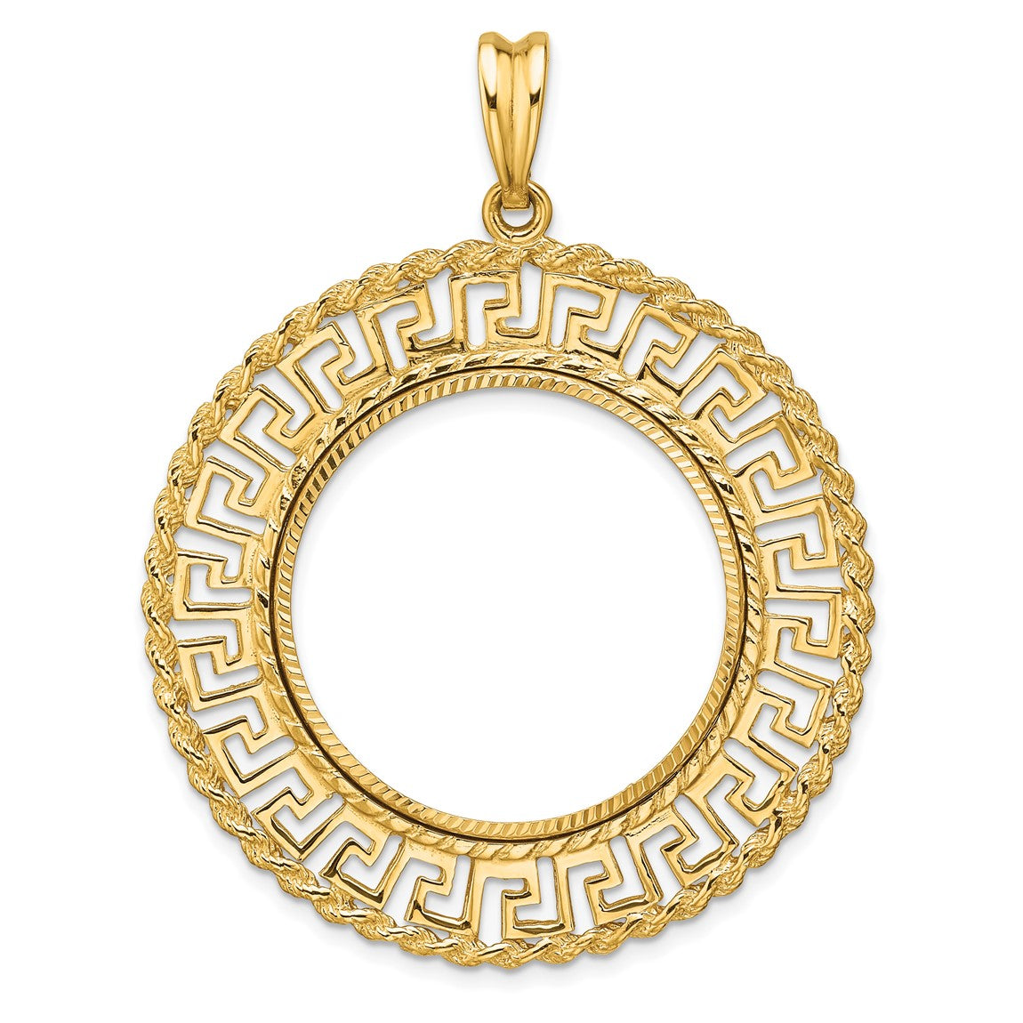 14k Yellow Gold Polished and Diamond-cut Greek Key with Rope Border 27.0mm Prong Coin Bezel Pendant - Fits 1/2 oz American Eagle, US $10 Liberty, and Other Coins