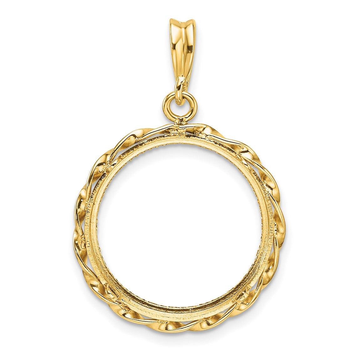 14k Yellow Gold Polished Hand Twisted Ribbon and Diamond-cut 18.0mm Prong Coin Bezel Pendant - Fits 1/10 oz Cat, 1/10 oz Panda, and US Dime