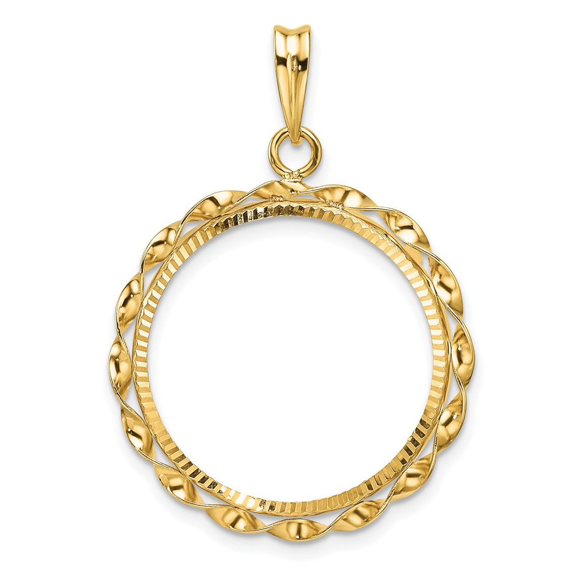 14k Yellow Gold Polished Hand Twisted Ribbon and Diamond-cut 21.6mm Prong Coin Bezel Pendant - Fits US $5 Bald Eagle and US $5 Congressional
