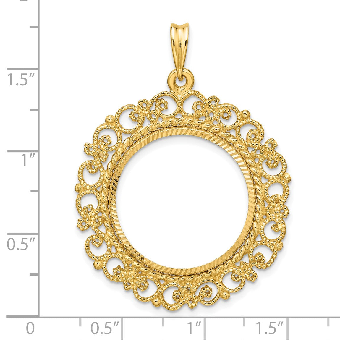 14k Yellow Gold Polished Textured and Diamond-cut Victorian-Style 21.6mm Prong Coin Bezel Pendant - Fits US $5 Bald Eagle, US $5 Congressional, US $5 Liberty, and Other Coins