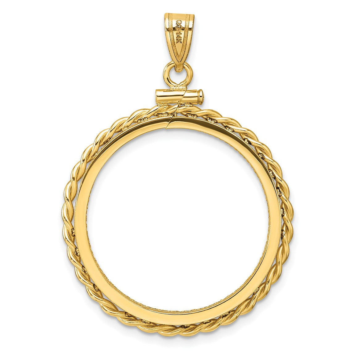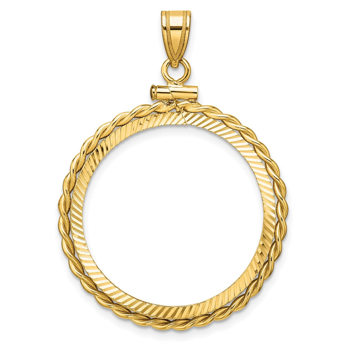 14k Yellow Gold Polished Twisted Wire and Diamond-cut 25.0mm x 2.35mm Screw Top Coin Bezel Pendant - Fits 1/2 oz Maple Leaf and Other Coins