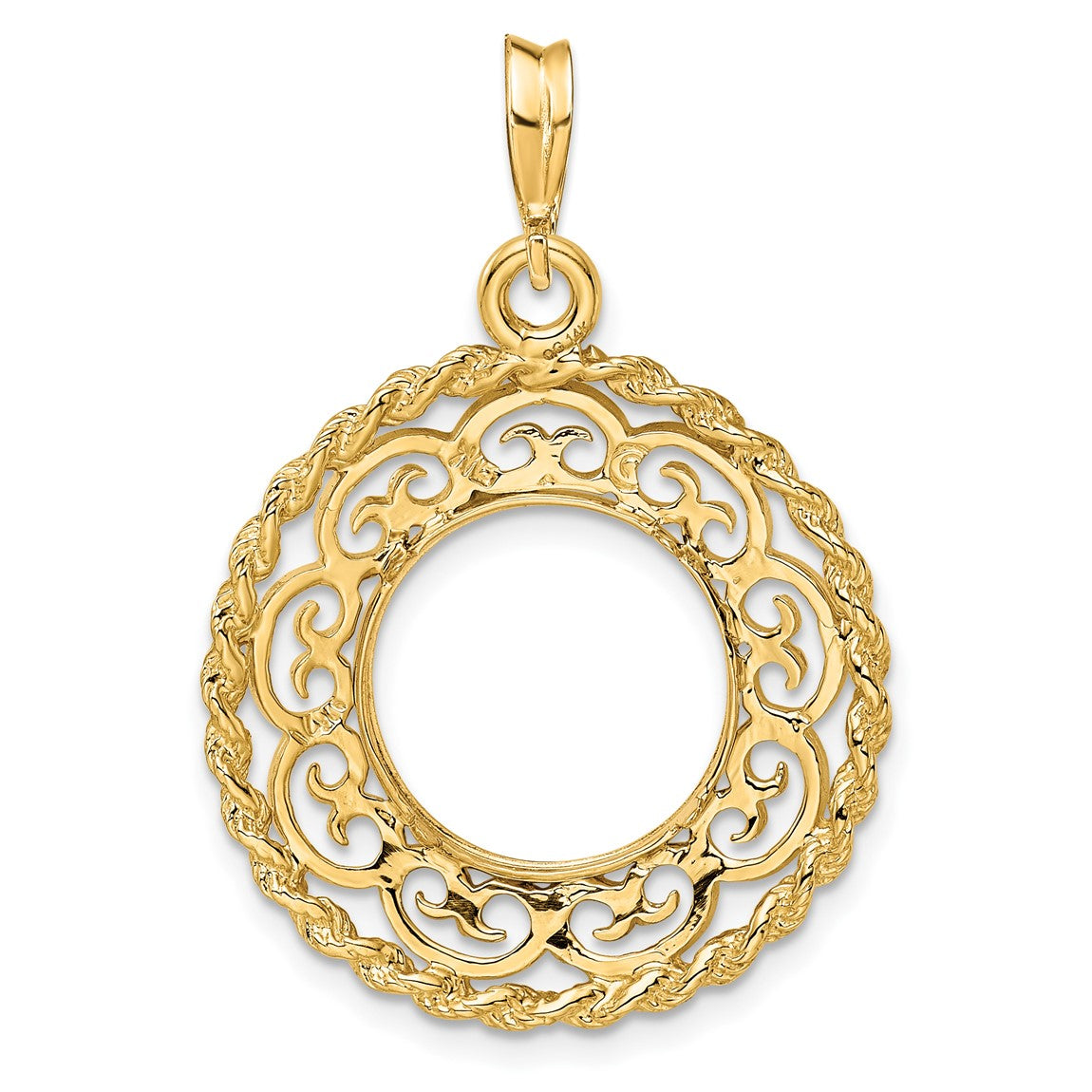 14k Yellow Gold Rope Edge w/ Scroll Design 13mm Prong Coin Bezel Pendant - Fits 2 Pesos and US $1