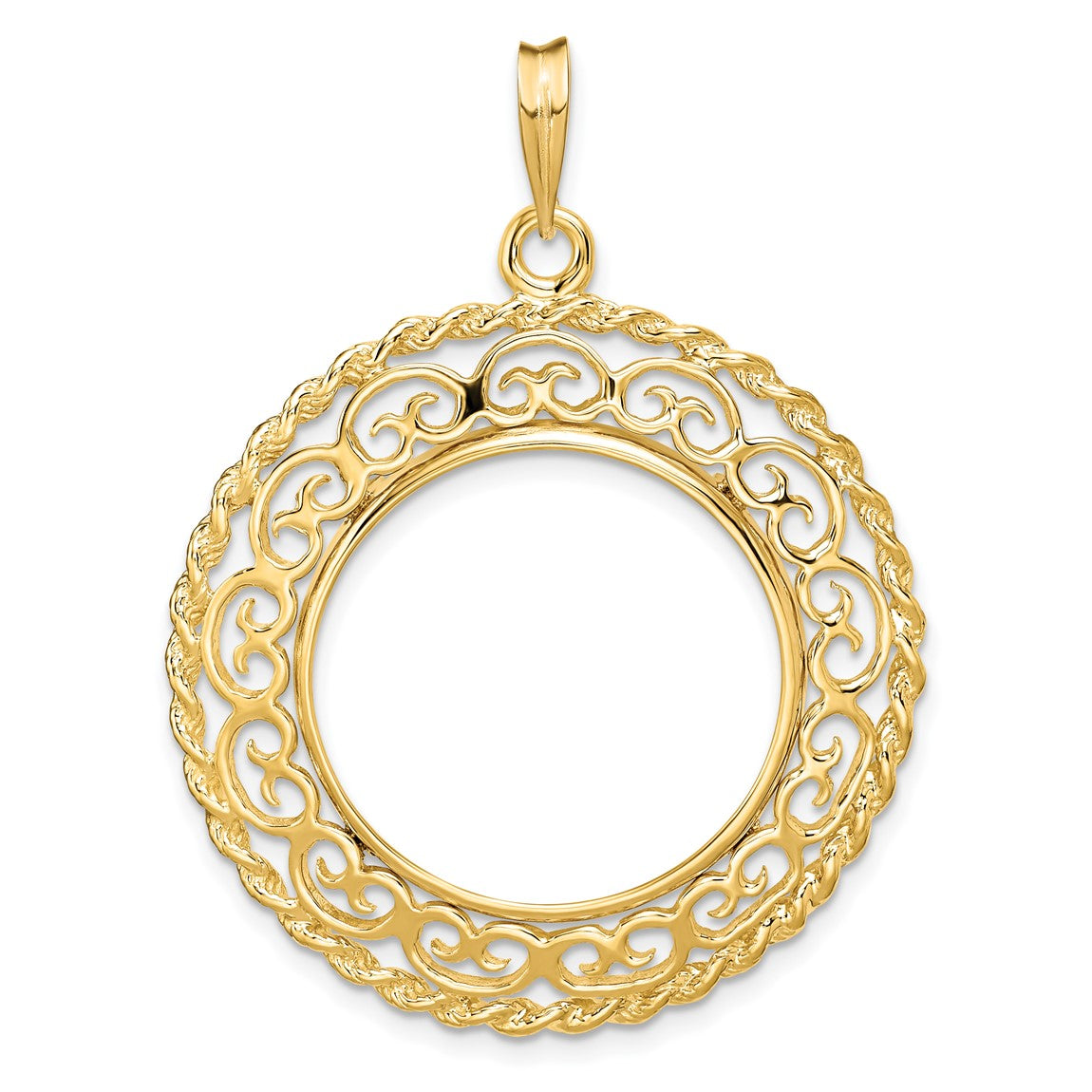 14k Yellow Gold Rope Edge w/ Scroll Design 22mm Prong Coin Bezel Pendant - Fits 1/4 oz American Eagle and Other Coins