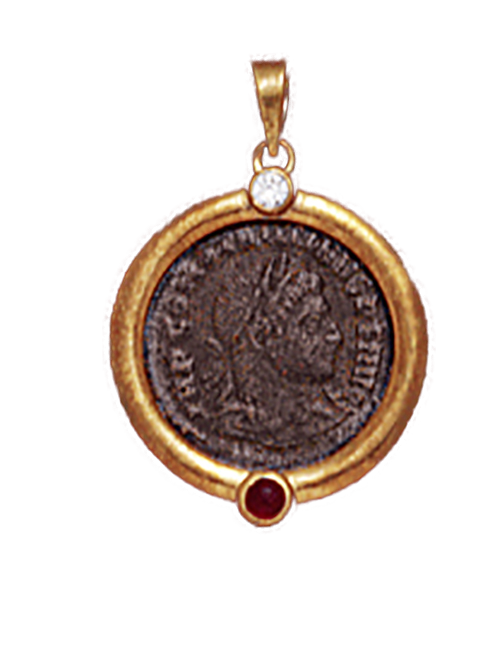 14K Gold DIAMOND/RUBY BEZEL Pendant With Bronze Roman Coin