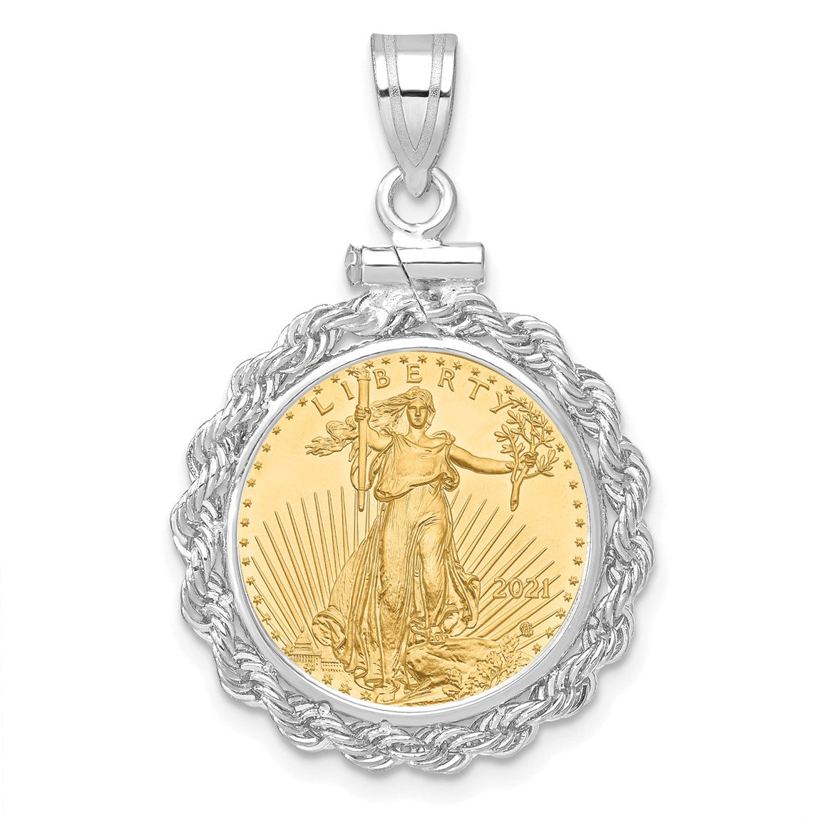 14k White Gold Polished Rope Mounted 1/10oz American Eagle Screw Top Coin Bezel Pendant