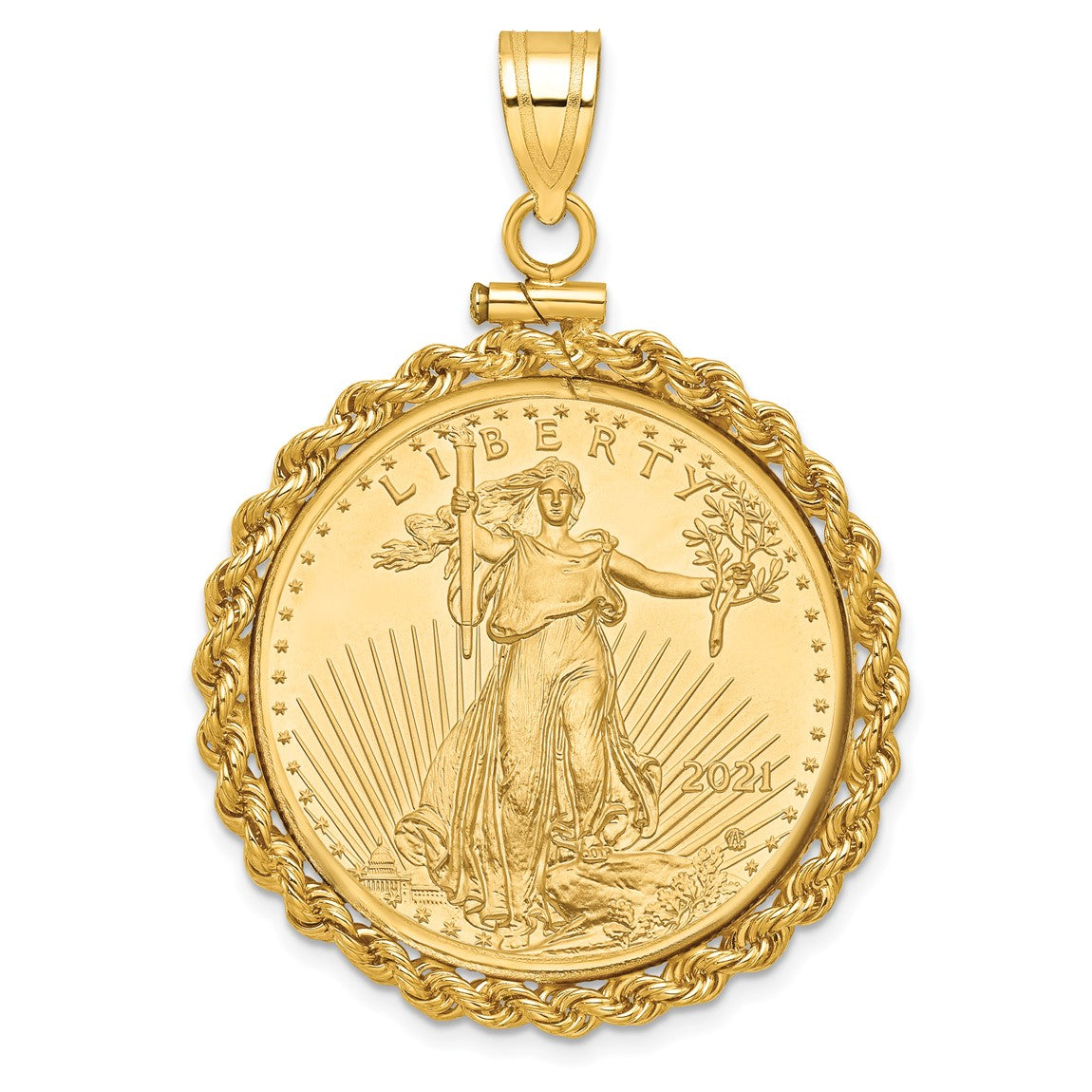 14k Yellow Gold Polished Rope Mounted 1/2oz American Eagle Screw Top Coin Bezel Pendant