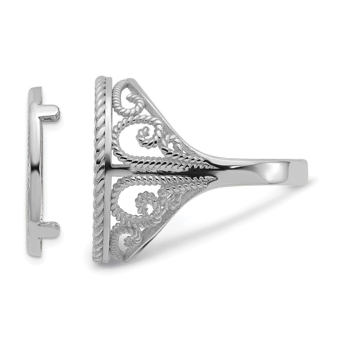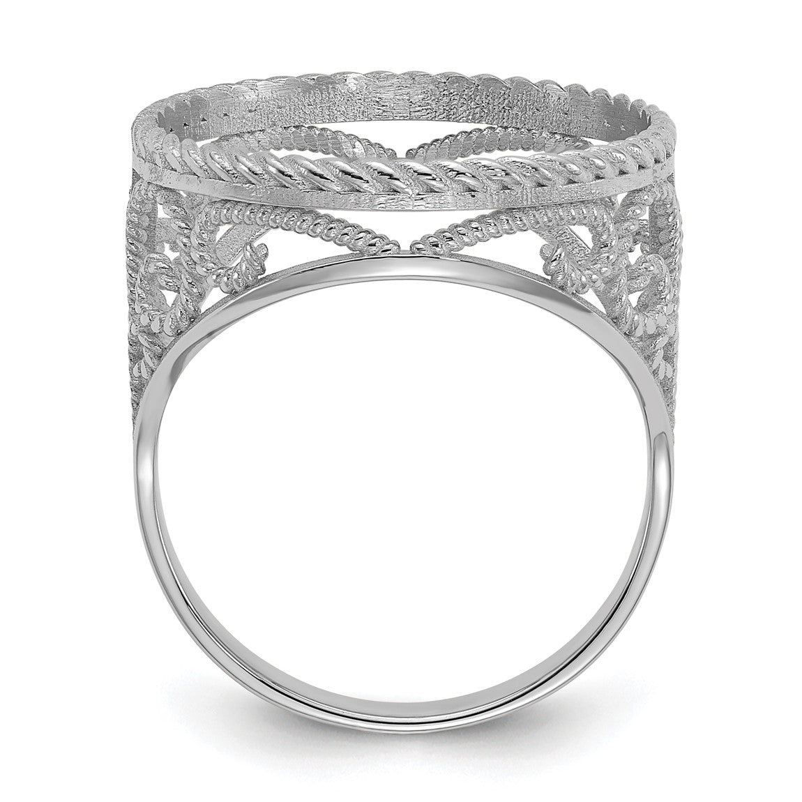 14k White Gold Ladies Diamond-cut & Twisted Wire Scroll Design 16.5mm Coin Bezel Ring - Fits 1/10 oz American Eagle and 1/10 oz Krugerrand