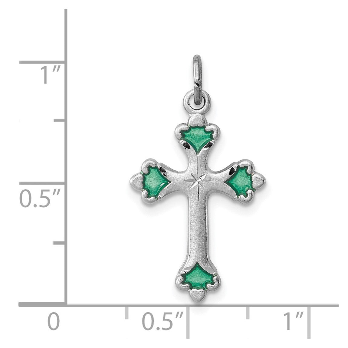 Sterling Silver Rhodium-plated Green Enameled Budded Cross Charm