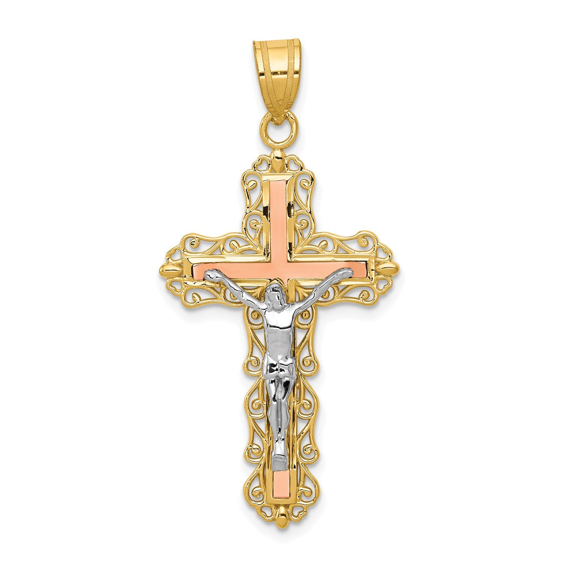 14k Yellow, White and Rose Gold Diamond-Cut Crucifix Pendant D3645