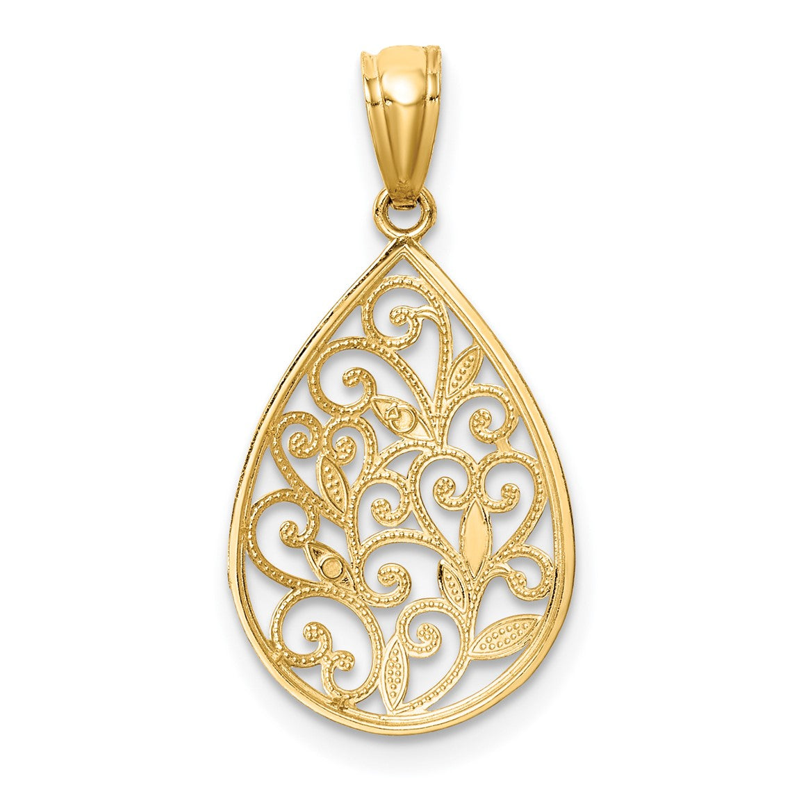 14k Yellow Gold Polished and Textured Small Filigree Teardrop Pendant