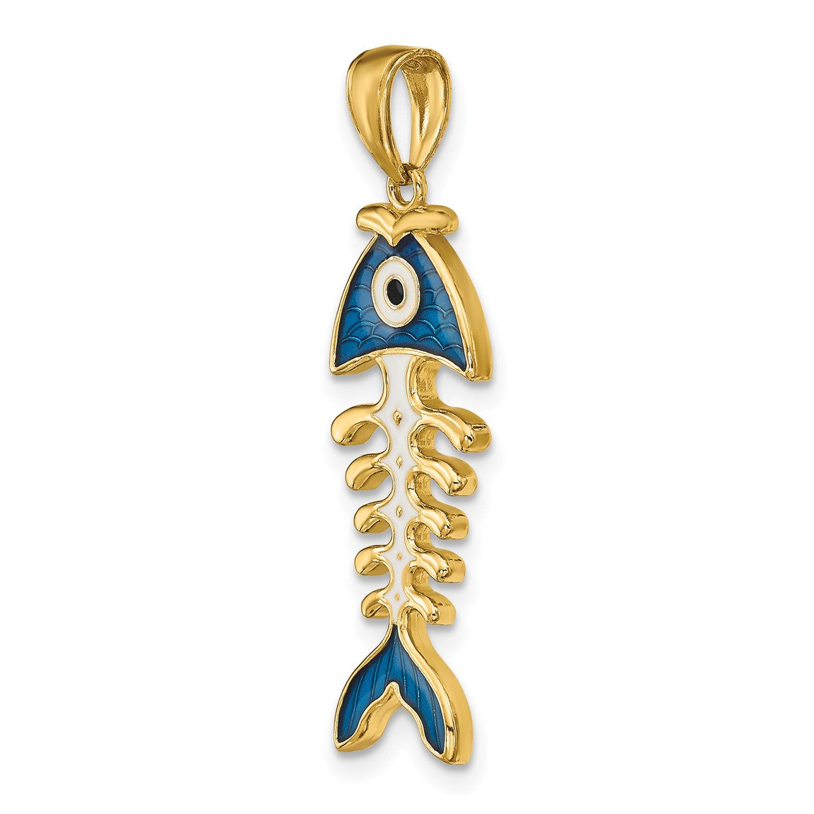 14k Yellow Gold 3D Blue Enamel Fish Bone Pendant
