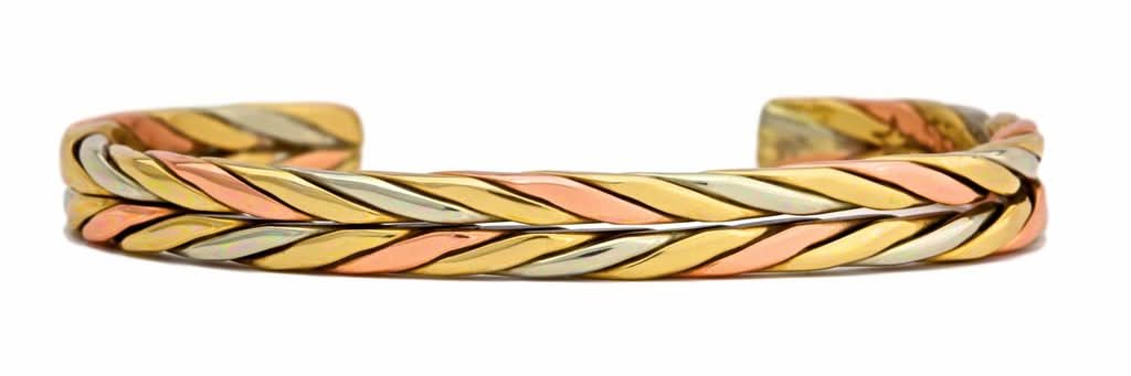 Our yellow metal is Jeweler's Brass, an alloy of 85% copper and 15% zinc, both essential minerals worn since prehistoric times by many non-related cultures around the world. Science has already proven that metals such as copper are absorbed through the skin, so besides their beauty, our bracelets can also be considered a time-release source of essential minerals.
