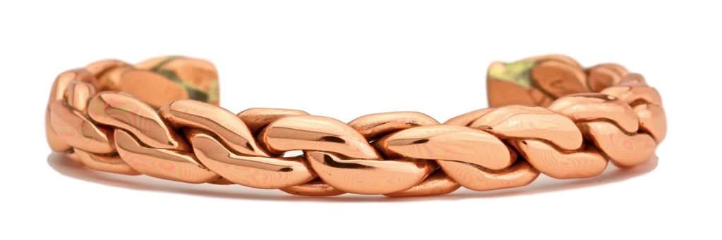 Solid and very strong chain-like design handcrafted in the USA with 99.999% copper wires. While braided, each bracelet is repeatedly and carefully heat-treated to maintain its natural malleability.