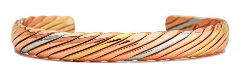 Our yellow metal is Jeweler's Brass, an alloy of 85% copper and 15% zinc, both essential minerals worn since prehistoric times by many non-related cultures around the world. Science has already proven that metals such as copper are absorbed through the skin, so besides their beauty, our bracelets can also be considered a time-release source of essential minerals.