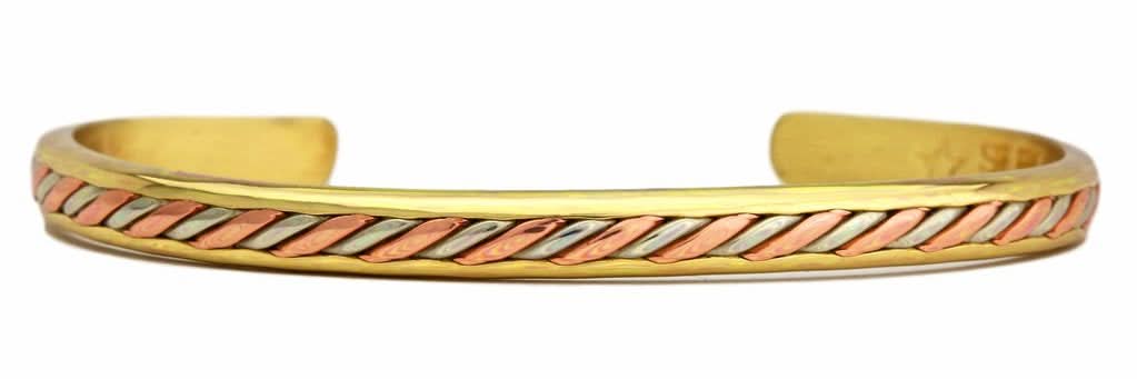 Our yellow metal is Jeweler's Brass, an alloy of 85% copper and 15% zinc, both essential minerals worn since prehistoric times by many non-related cultures around the world. Science has already proven that metals such as copper are absorbed through the skin, so besides their beauty, our bracelets can also be considered a time-release source of essential minerals.